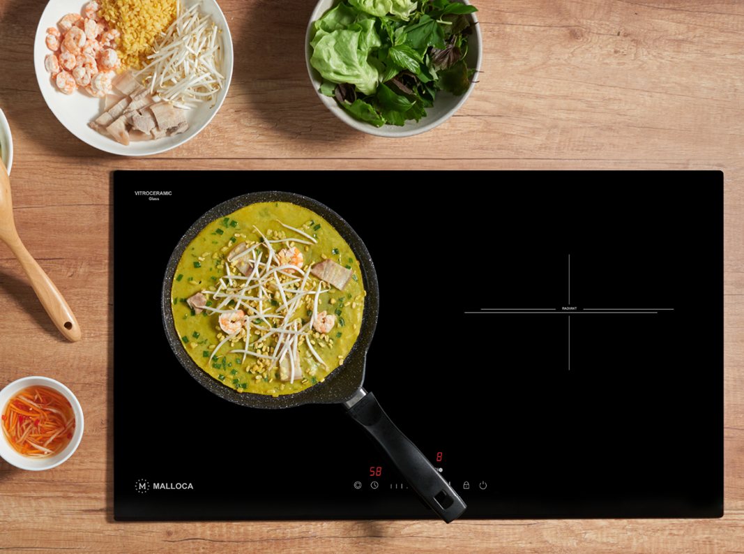 - 01 Vùng nấu lớn 2 vòng nhiệt có thể điều chỉnh để phù hợp với kích thước nồi nấu lớn bé, tránh thất thoát nhiệt, tiết kiệm điện năng\