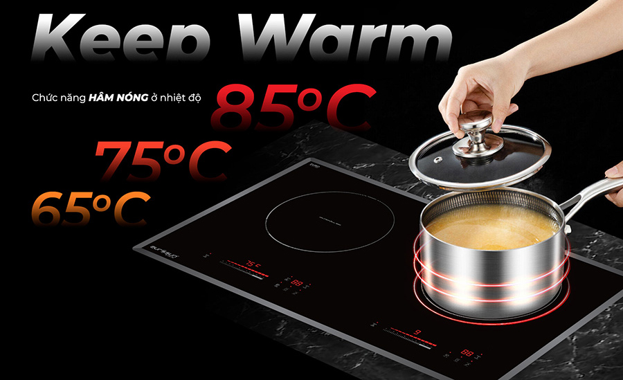 Bếp có khả năng ủ ấm ở 3 mức nhiệt độ mong muốn, chức năng ủ ấm được lập trình giữ ở mức nhiệt độ ổn định ở mức 65ºC, 75ºC, 85ºC giúp duy trì nhiệt độ cho thức ăn luôn nóng, ấm mà không phải đun lại nhiều lần làm giảm dinh dưỡng trong thức ăn