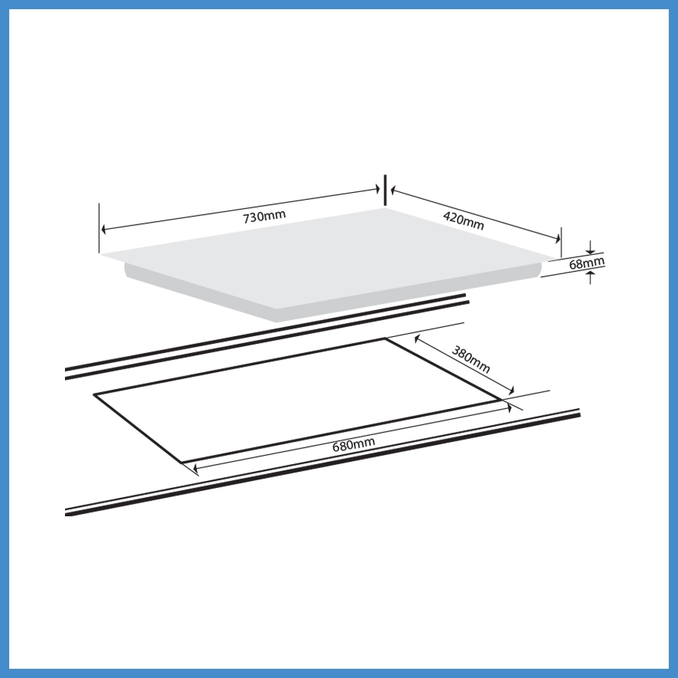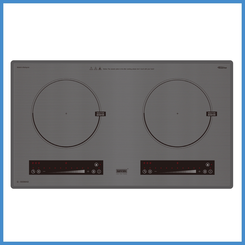 Bếp từ âm Giovani G-555 MAS với 2 vùng nấu rộng rãi. Mặt kính Ceramic màu xám. Chịu lực và chịu sốc nhiệt cao, chống trầy xước, và dễ dàng vệ sinh