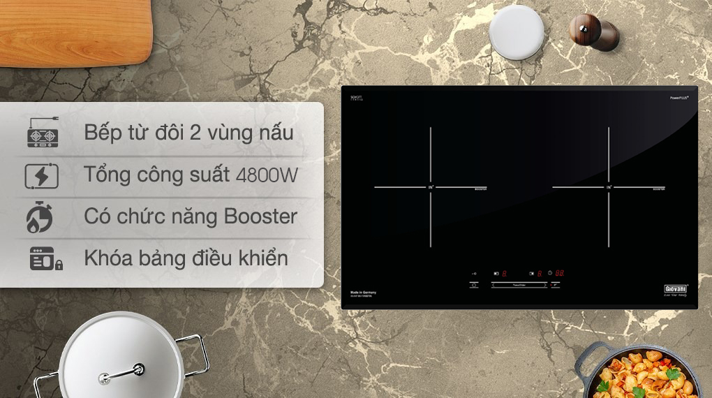 Chức năng Booster 2 vùng nấu riêng biệt có khả năng kích công suất cực đại lên đến 3000W cho mỗi vùng nấu giúp công việc đun nấu trở nên nhanh chóng và tiết kiệm thời gian khi cần thiết