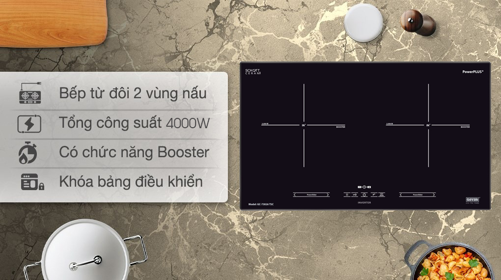 Bếp từ âm Giovani GC-73026 TSC với 2 vùng nấu rộng rãi. Mặt kính Schott Ceran - Đức. Chịu lực và chịu sốc nhiệt cao, chống trầy xước, và dễ dàng vệ sinh