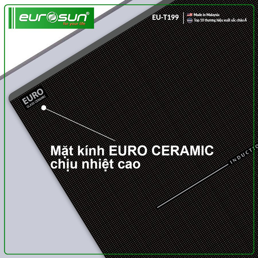 Bếp từ Eurosun EU-T506Do với 2 vùng nấu. Mặt kính EuroCeramic chịu lực và chịu sốc nhiệt cao, dễ dàng vệ sinh