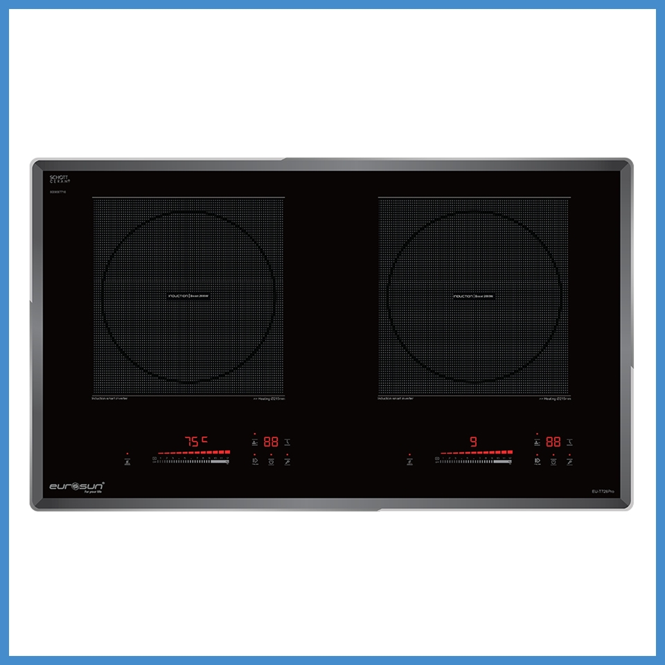 Bếp từ Eurosun EU-T726Pro với 2 vùng nấu rộng rãi. Mặt kính SchottCeran có khả năng chịu lực lên đến 15Kg, và chịu sốc nhiệt lên đến 1000ºC, mặt kính được vát 4 cạnh, bo viền nhôm tinh tế sang trọng