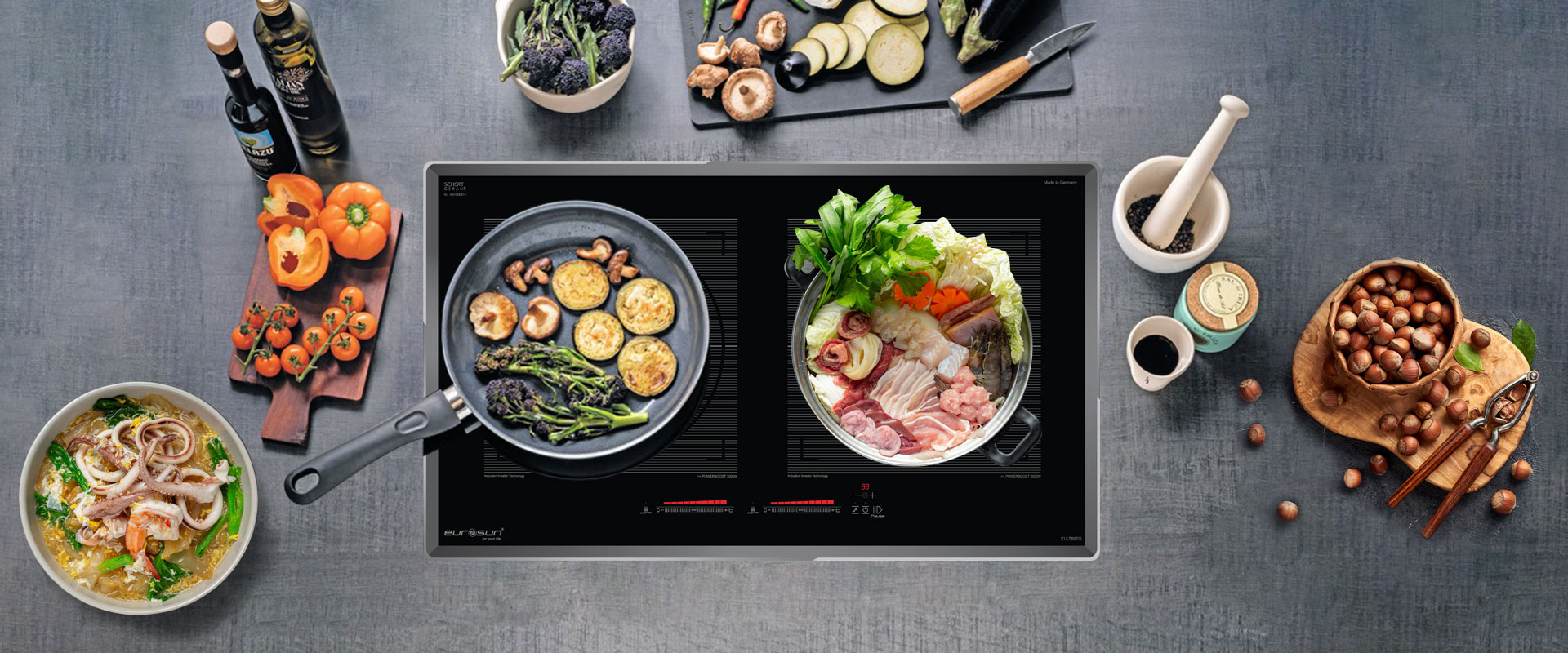 Bếp từ Eurosun EU-T897G tiết kiệm 35% điện năng bởi tích hợp công nghệ biến tần Bridge Inverter, cảm biến thông minh đun nấu và giữ liên tục ở mức thấp
