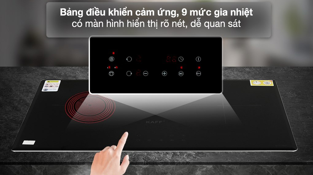 Bảng điều khiển cảm ứng dạng nhấn trực quan dễ dàng điều chỉnh các chức năng, mức công suất chính xác, với 9 mức gia nhiệt + Booster. Tất cả các thông số nhiệt độ, công suất, thời gian được hiển thị đầy đủ và rõ ràng trên màn hình điều khiển của bếp