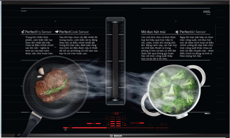 Cảm biến nhiệt PerfectAir : liên tục theo dõi không khí và điều chỉnh mức công suất phù hợp với hơi và mùi bốc lên - liên tục, chính xác và độc lập với các cài đặt nguồn. Đồng thời công nghệ này giúp giảm tiếng ồn bằng cách chỉ kích hoạt công suất hút ở mức tối thiểu. Một hiểu quả bổ sung tích cực khác : không cần điều khiển bằng tay. Khi bạn nấu xong, quạt gió tiếp tục chạy cho đến khi không khí trong bếp sạch hết mùi khó chịu. Vì vậy bạn có thể dành trọn tâm trí cho việc nấu nướng thay vì điều khiển máy hút mùi