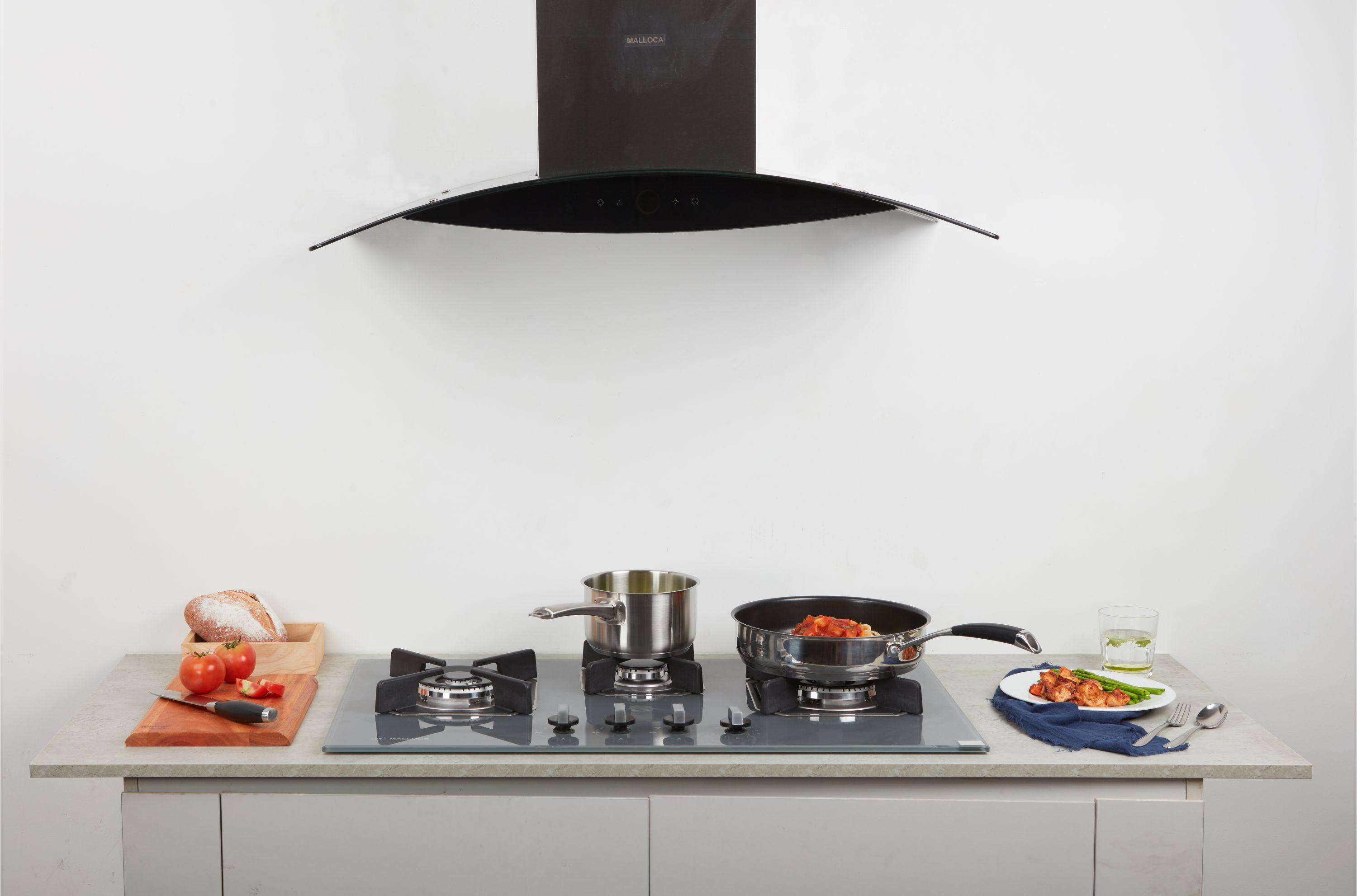 Máy hút khử mùi nhà bếp Malloca MC 7018HS lắp đặt áp tường hoặc áp tủ bếp, với thiết kế kính cong